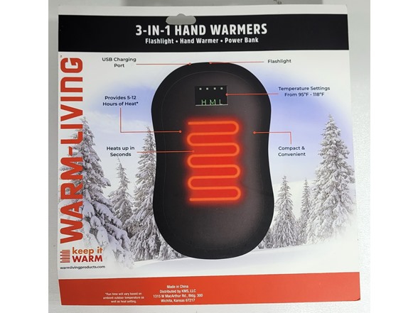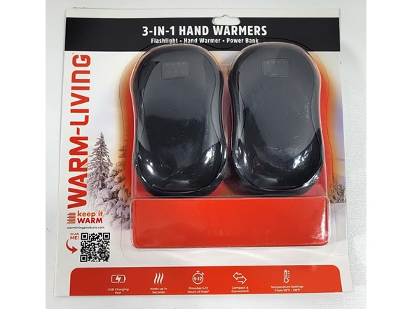 In the Box:- (1) Warm-Living CP-HW01-BLK-DSP Warm Living 3-In-1 Hand Warmer/Power Bank/Flashlight Black