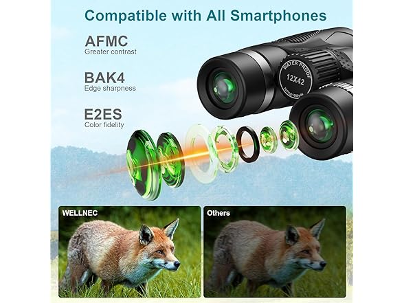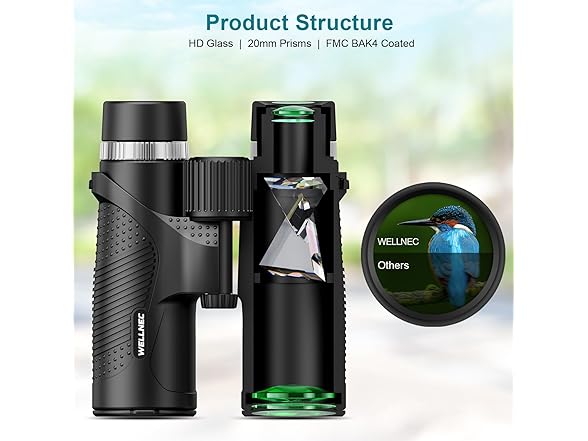 - 【HD High Powered Binoculars】 Equipped with multi-coated lenses and large BAK4 prisms. WELLNEC professional binoculars for adult for higher light transmittance and natural color fidelity. You can see vivid details even in low light, dawn or dusk.
