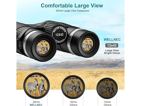 - 【20mm Large Eyepiece Binoculars, Larger Image, Clearer Details】20mm large eyepiece, 12X high power magnification and 42mm objective lenses, provides you 303ft/1000yds large field of view, delivers the widest, most natural view and leaves nothing hidden. Perfect for birdwatching, hunting, cruise ship, travel, etc.