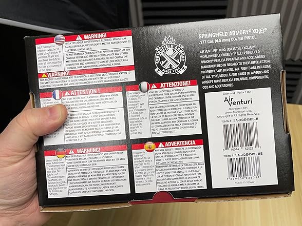 The Air Venturi manufactured Springfield Armory XD(E) BB Pistol is a slim and compact CO2 airgun with a unique double action/single action trigger with incredible realism and authenticity. It features exceptional attention to detail and genuine look and feel, making it a perfect replica version of the real steel model that's well-suited to practice or plinking. Capable of velocities up to 380 FPS and featuring an 18 round drop free magazine, this air pistol has convincing operation because of its blowback feature that simulates recoil. With an ambidextrous safety and magazine release, the airgun can be operated easily by a variety of shooters, and the functional takedown lever means it can be taken apart like its firearm counterpart. Front and rear slide serrations and authentic grip texturing provide for an ergonomic and convenient shooting experience. In addition, the windage adjustable front red fiber optic sight and fixed two dot rear sight aid accuracy, and an under-muzzle single-slot Picatinny rail allows for the addition of accessories like lights and lasers.