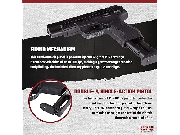 - DOUBLE- & SINGLE-ACTION PISTOL: Our high-powered CO2 BB gun pistol has a double- and single-action trigger and ambidextrous safety. This air pistol weighs 1.95 lbs. to mimic the weight and feel of the classic firearm it's modeled after.