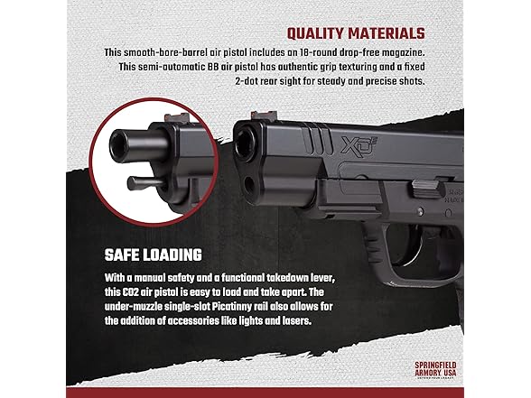 - SAFE LOADING: With a manual safety and a functional takedown lever, this CO2 BB pistol is easy to load and take apart. The under-muzzle single-slot Picatinny rail also allows for the addition of accessories like lights and lasers.