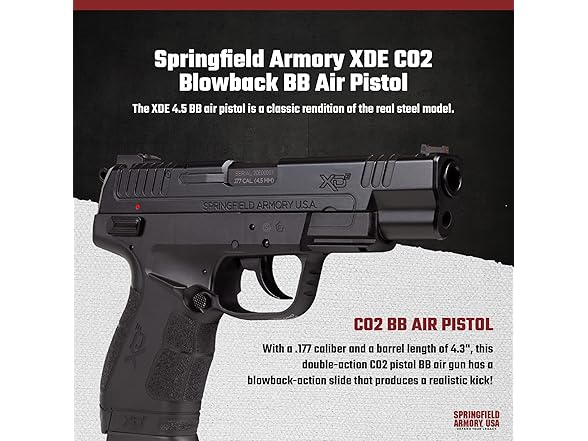 - CO2 BB AIR PISTOL: The XDE 4.5-inch BB pistol is a classic rendition of the real steel model. With a .177 caliber and a barrel length of 4.3", this double-action CO2 pistol BB gun has a blowback-action slide that produces a realistic kick!