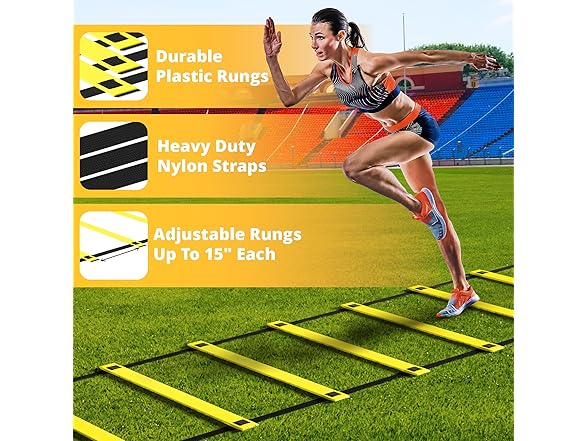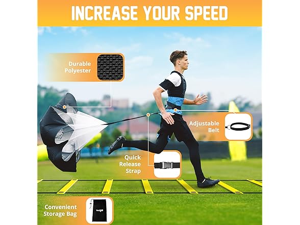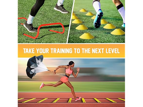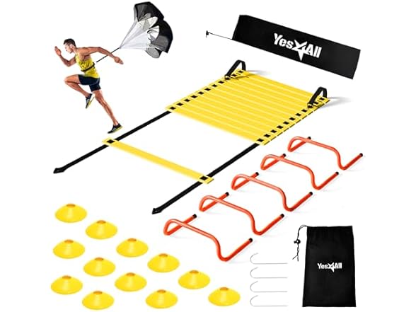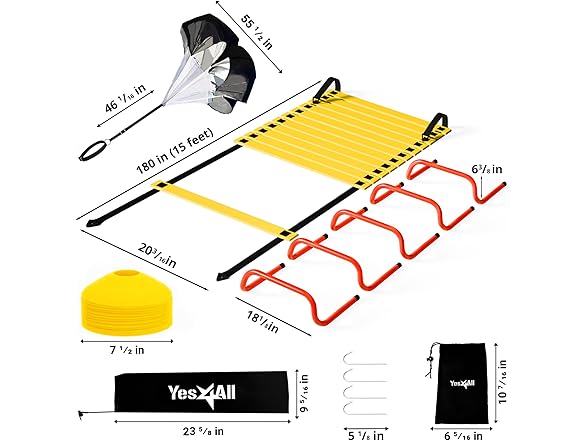 Yes4All Speed Training Equipment Set: 15ft Agility Ladder, Resistance Parachute, 5 Agility Hurdles, 12 Disc Cones with Carry Bag/Strap